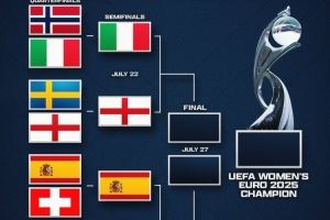 体育资讯7月20日讯 2025女足欧洲杯半决赛对阵出炉,意大利、英格兰、西班牙和德国会师四强。