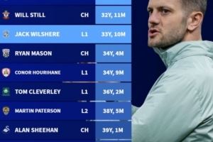 体育资讯10月14日讯 德国转会市场盘点了英国前四级别联赛球队主教练年龄情况,卢顿新帅威尔希尔以33岁10个月成第三年轻主教练。