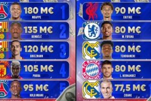 法国球员历史转会费榜:姆巴佩领衔4人过亿 埃基蒂克第6&齐祖第10