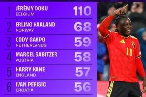 体育资讯11月20日讯 本届世欧预小组赛已经告一段落,squakwa也统计了本届赛事在对方禁区内触球情况,曼城边锋多库断崖领跑。